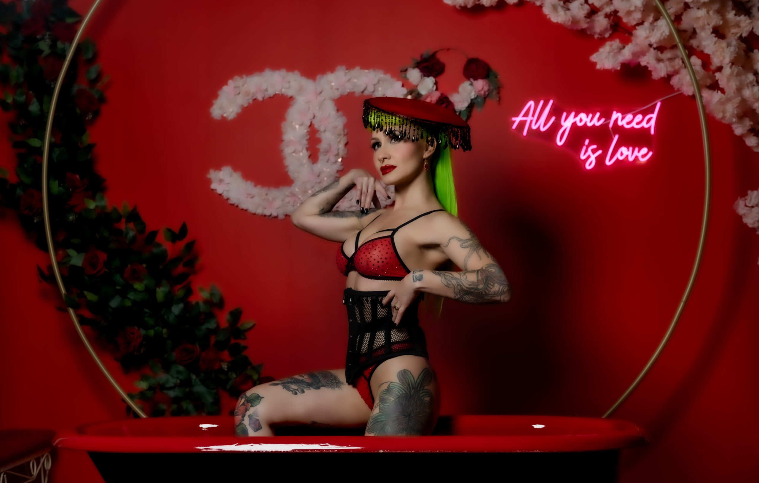Honey sits in red tub